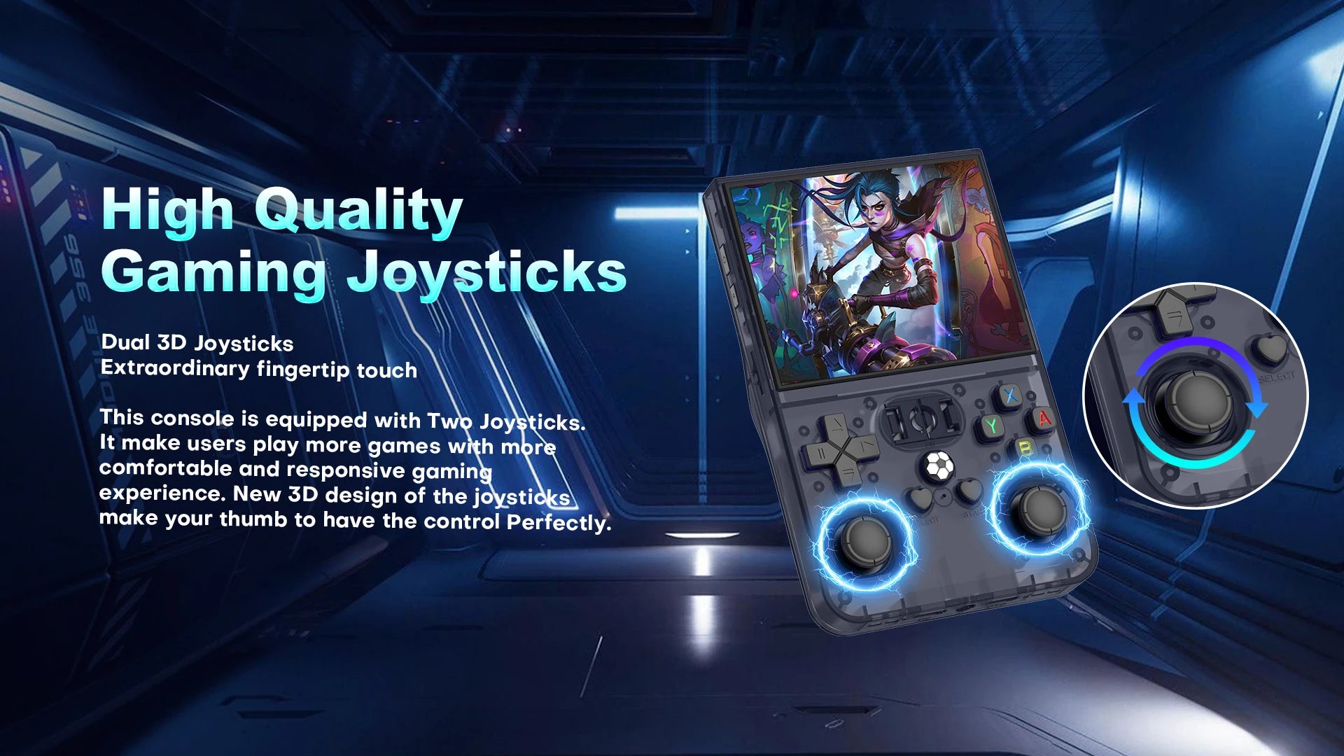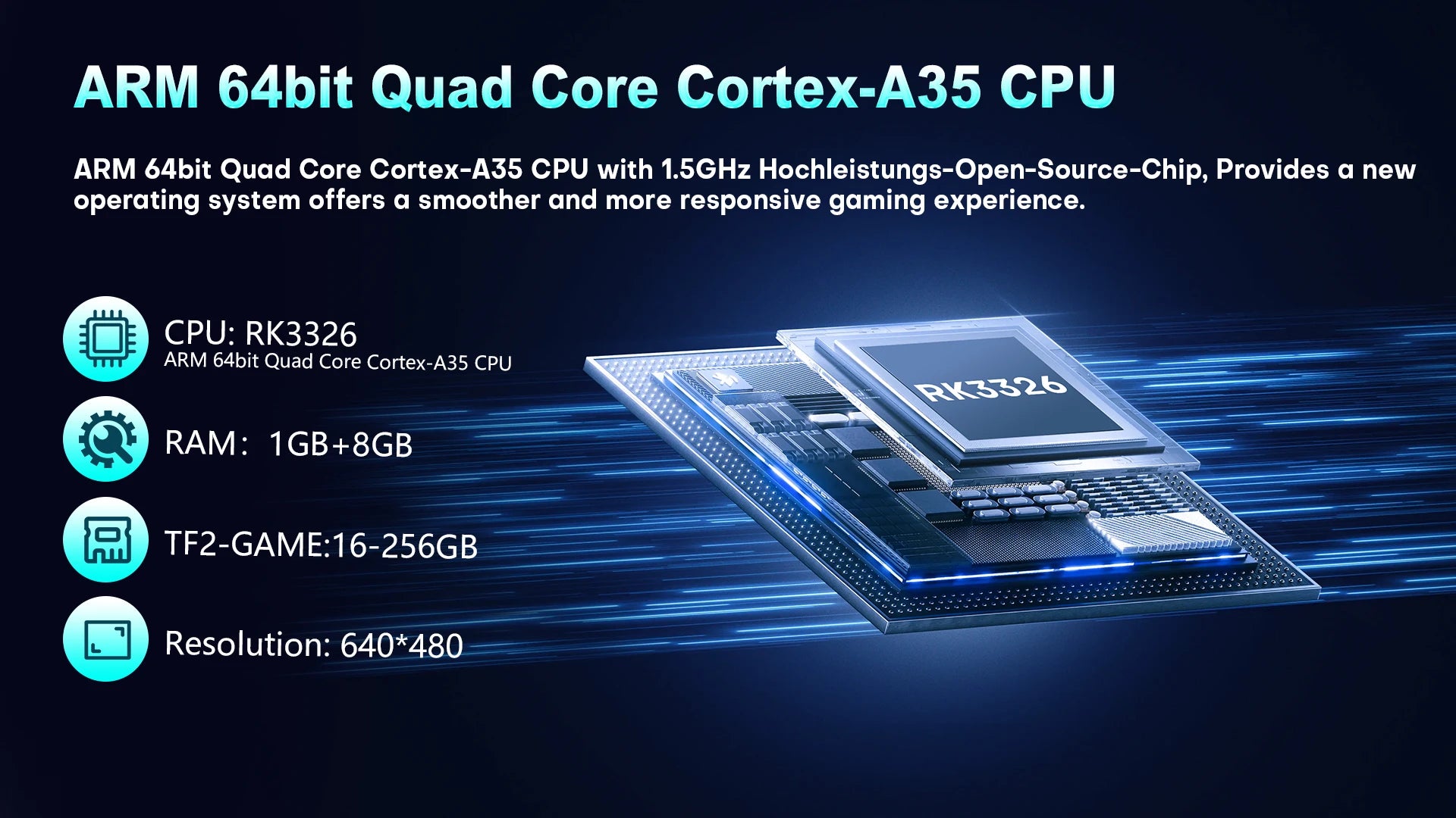 * Professional game chip RK3326, 1.5GHz, 64-bit, can easily run large 2D and some 3D games, no more delays when playing games.